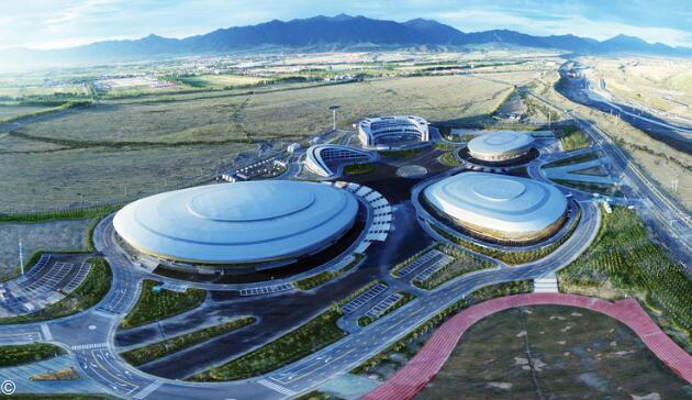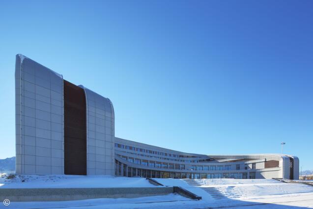 設(shè)計者(哈爾濱工業(yè)大學(xué)建筑設(shè)計研究院)從新疆獨特的雪山、戈壁等特色風(fēng)貌中提取設(shè)計靈感,以純凈的白色屋頂勾勒出自然雪帽的造型意向,以層狀處理的橫向線條模擬戈壁獨有的巖層地貌,以玻璃上雪花冰晶的模擬對地域特色進(jìn)行呼應(yīng)。整體建筑群仿佛掩映于皚皚白雪之中,立面形象疏朗大氣、飄逸靈動,與環(huán)境和諧共融,完整的實現(xiàn)了“天山腳下全運雪鄉(xiāng)”的意境。
